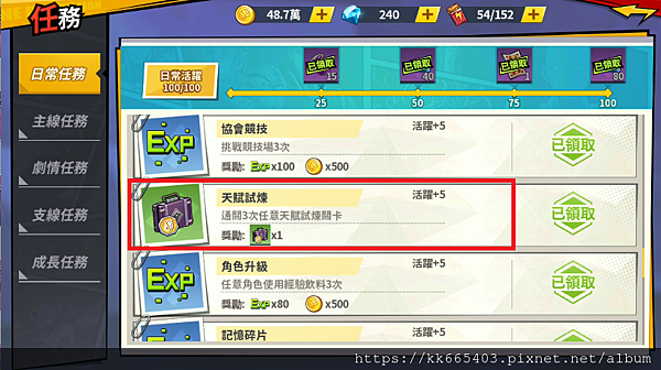 在每日任務裡也有通關3次任意天賦試煉3次可以拿到天賦印記寶箱,可隨機開到1個1級天賦印記
