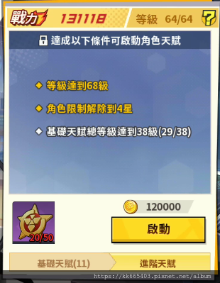 進階天賦需要將戰隊等級提升到68級/角色星數解除到4星/基礎天賦總等級達到38級,消耗徽章50個解鎖